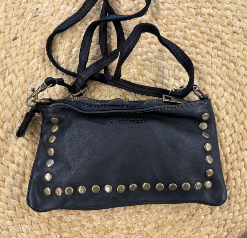 100% leren tasje met ritssluiting, afneembaar en verstelbaar lang hengsel, studds, afmeting: H12xB21xD3cm.