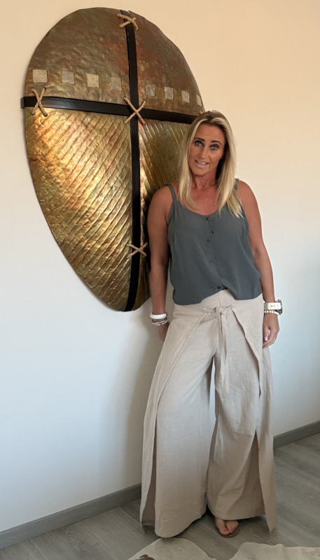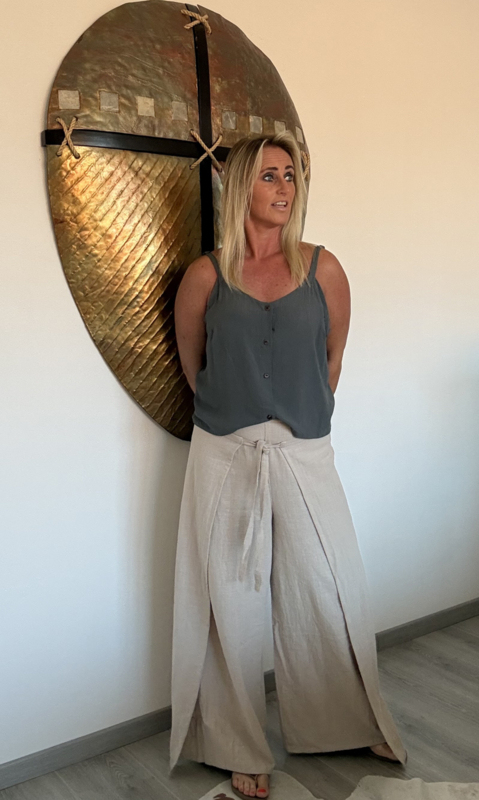 De broek heeft een elastische tailleband van achter, heeft een overslag die je aan de voorkant van de broek moet knopen, 100% linnen, one size (XS t/m L), bovenwijdte is ca. 43cm.