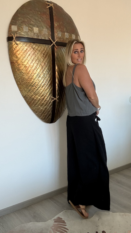 De broek heeft een elastische tailleband van achter, heeft een overslag die je aan de voorkant van de broek moet knopen, 100% linnen, one size (XS t/m L), bovenwijdte is ca. 43cm