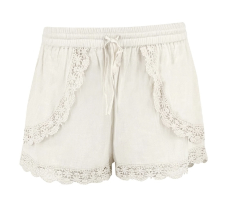 Korte broek met kanten afwerking langs de randen, met elastiekin de tailleband en zakken in de zijkant, 100% cotton, pasvorm: valt goed op maat, lengte gemeten bij maat XS/S: 31cm, M/L:33cm, XL/XXL: 35cm, taillebreedte: XS/S: 66cm, M/L: 70cm, XL/XXL: 74cm.