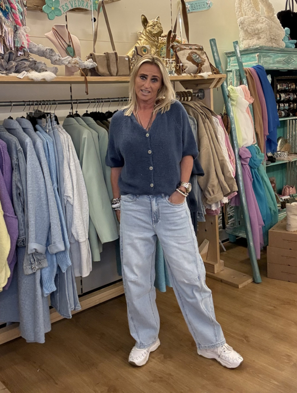 Licht blauwe jeans in een barrel/ballon model, ritssluiting met knoop, lopen naden over de broek, 96% cotton, 3% polyester, 1% elastaan.