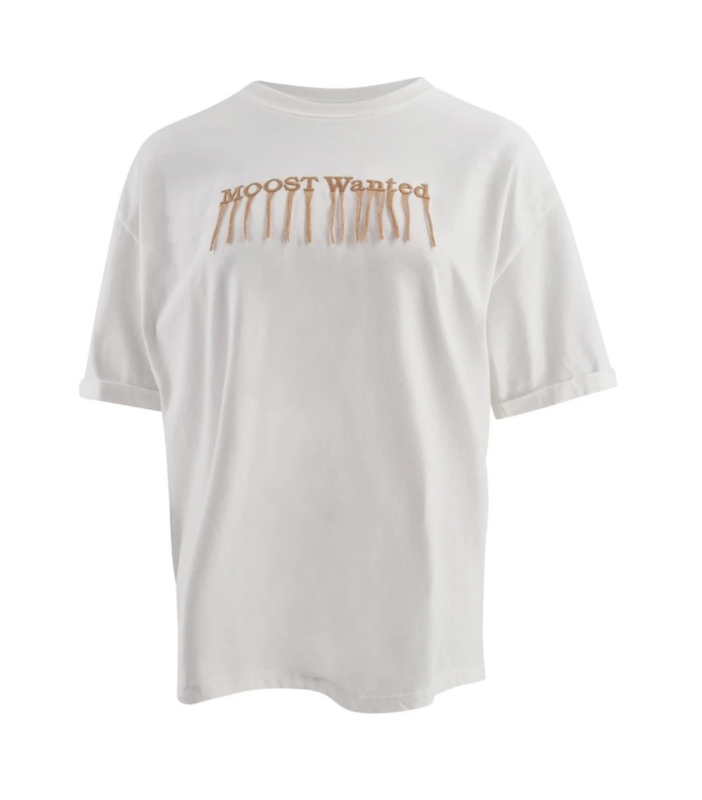 T-shirt met een Moost Wanted logo op de voorkant, logo is bezet met franjes voor een stoere look, 100% katoen, lengte gemeten bij maat S: 68cm, M: 69cm, L: 70cm, XL: 71cm. Borstomvang gemeten bij maat S: 116cm, M: 120cm, L: 124cm, XL: 128cm.