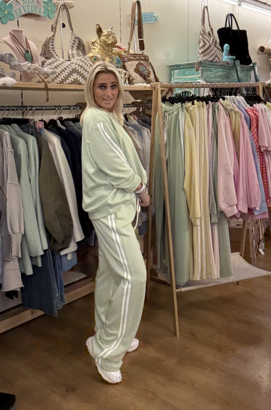 Comfy broek bestaat uit een makkelijke zachte stof, de broek heeft een elastische tailleband en aansnoerkoord, witte strepen aan de zijkanten van de broek, 2 steekzakken, one size (kan gedragen worden t/m maat 42/XL).