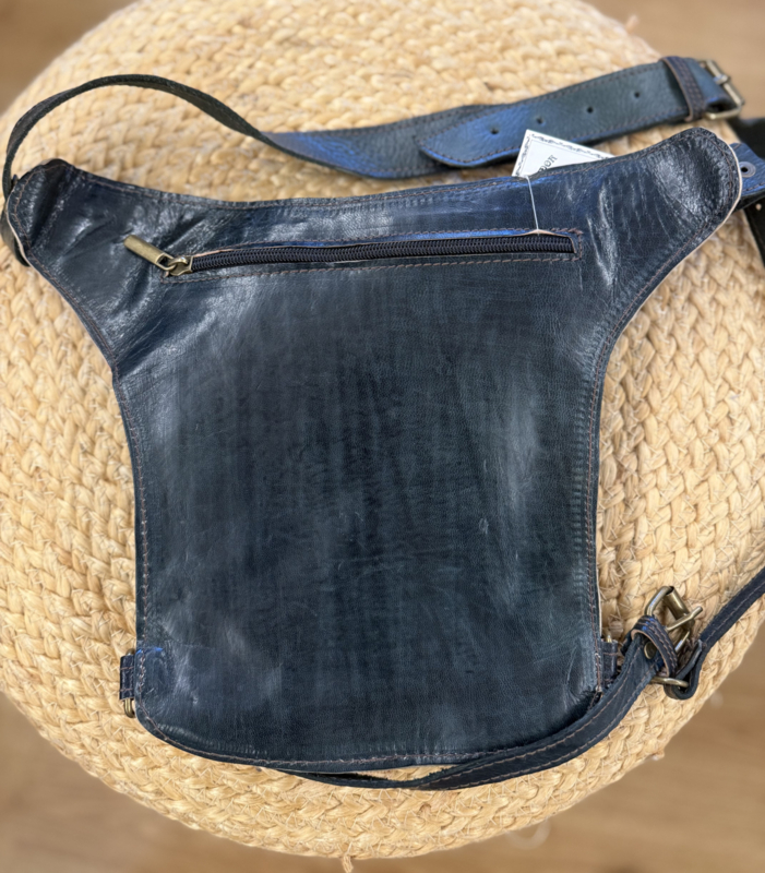 Heuptas van leer met een riem die je kunt verstellen om je middel, tas heeft sierringen, vak met een gespsluiting, vak met ritssluiting en aan de achterkant zit ook een vak met ritssluiting, 100% leer, afmeting: H24 x B18,5cm. Lengte riem 118cm