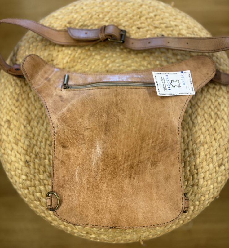 Heuptas van leer met een riem die je kunt verstellen om je middel, tas heeft sierringen, vak met een gespsluiting, vak met ritssluiting en aan de achterkant zit ook een vak met ritssluiting, 100% leer, afmeting: H24 x B18,5cm