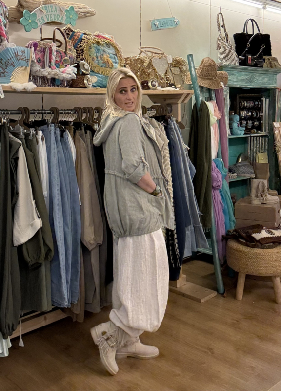 Jasje van 100% linnen met capuchon, aansnoerkoord bij de taille zodat je het jasje kan tailleren, 1 knoopsluiting middenvoor, 2 zakjes aan de voorkant, lange mouwen deze kun je rollen en vastzetten met een knoopje, koord onderaan het jasje zodat je deze onder ook aan kunt snoeren, one size (S t/m XL), 100% linnen.