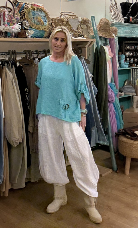 Broek Pure van 100% linnen, 2 steekzakken met een houten sierknoop, siernaden, one size (S t/m XL), 100% linnen.