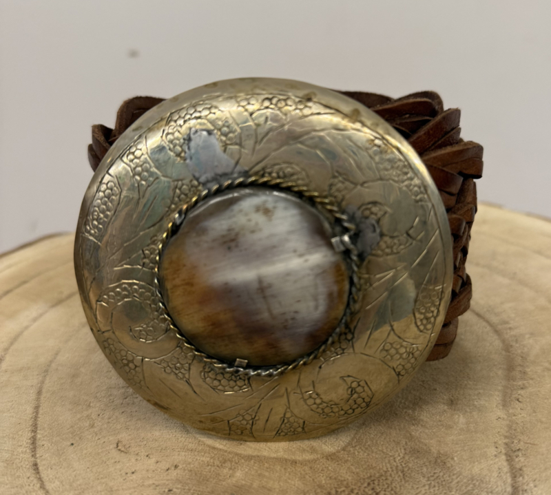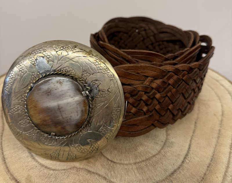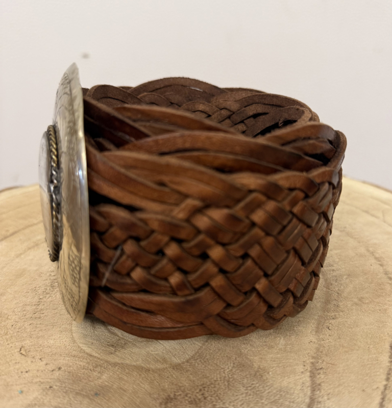 Bohemian gevlochten leren riem in donker bruin met een natuurstenen gesp, afmeting lengte ca. 111cm, breed 6,5cm, afmeting gesp 9x9cm. 100% leather.