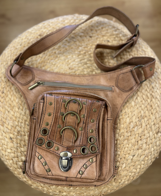 Leren Heuptas Eularia CognacHeuptas van leer met een riem die je kunt verstellen om je middel, tas heeft sierringen, vak met een gespsluiting, vak met ritssluiting en aan de achterkant zit ook een vak met ritssluiting, 100% leer, afmeting: H24 x B18,5cm