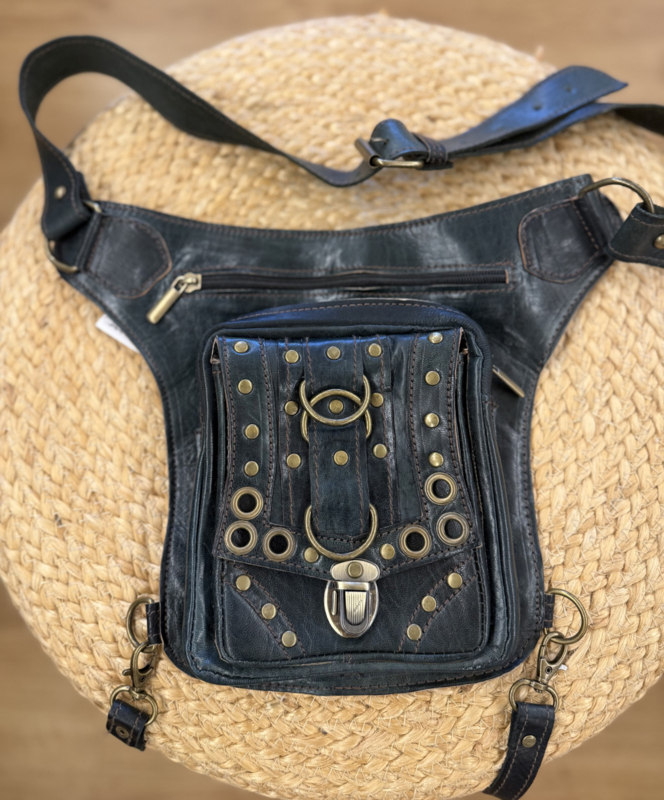 Leren Heuptas Eularia ZwartHeuptas van leer met een riem die je kunt verstellen om je middel, tas heeft sierringen, vak met een gespsluiting, vak met ritssluiting en aan de achterkant zit ook een vak met ritssluiting, 100% leer, afmeting: H24 x B18,5cm.…